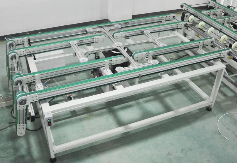 自動(dòng)完成電池板旋轉(zhuǎn)90°,改變傳送方式。此段可根據(jù)組件尺寸適合層壓機(jī)的擺放料方式,由程序選擇旋轉(zhuǎn)或不旋轉(zhuǎn)(組件“田”字型擺放時(shí)須旋轉(zhuǎn))。